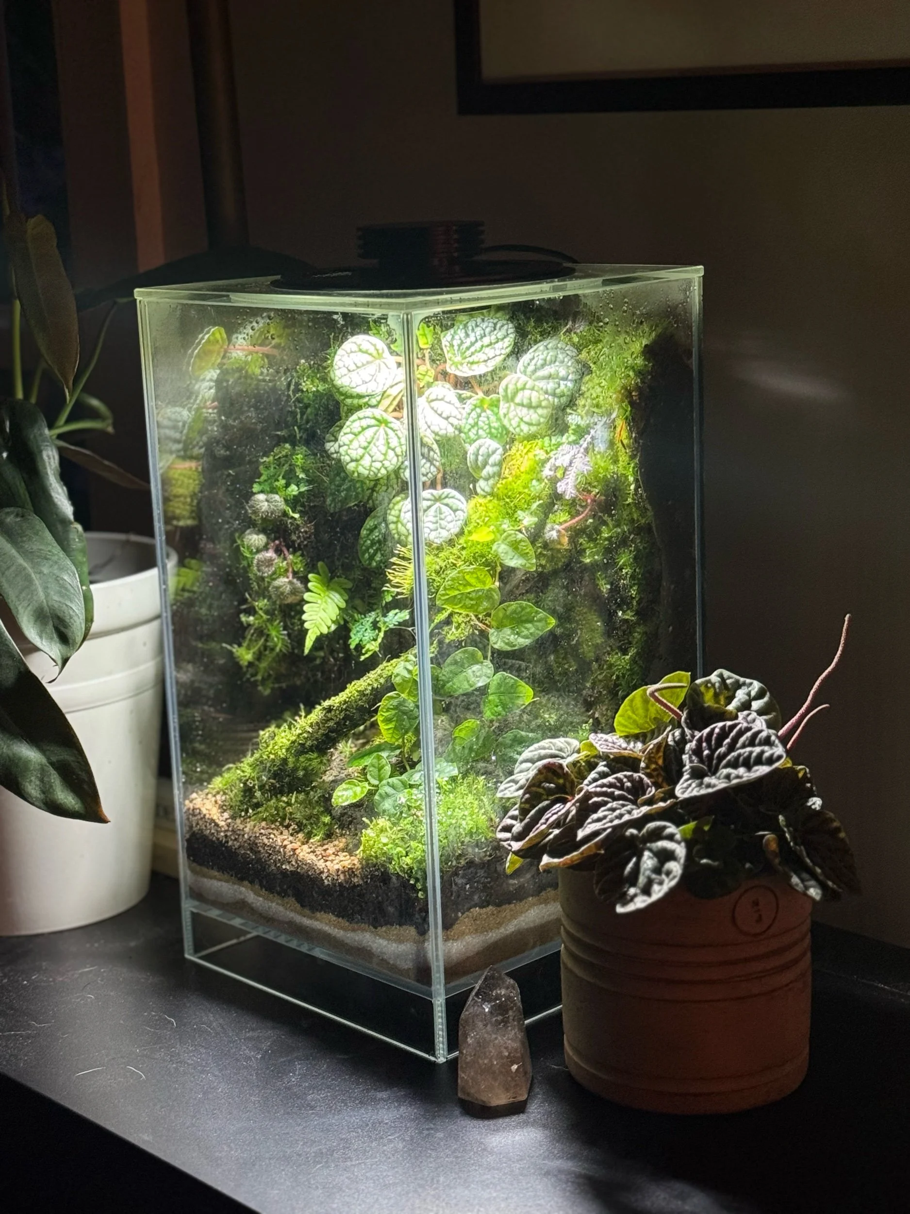 This terrarium is the perfect fit for someone with a dark corner. The terrarium showcases vibrant moss species and a beautiful peperomia.